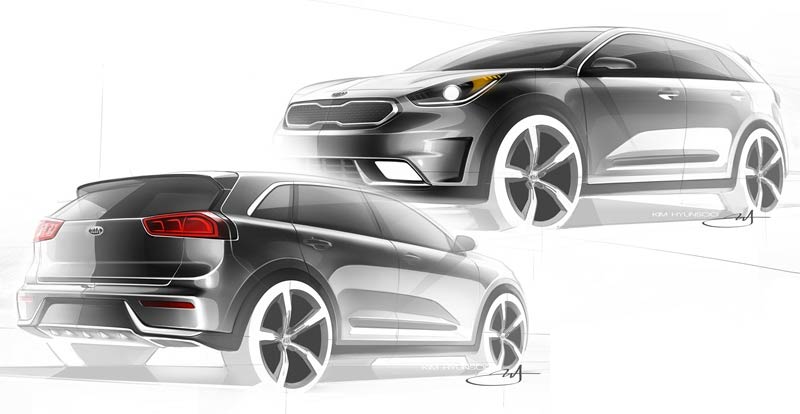 Kia a dévoilé des esquisses de son tout nouveau Niro, un véhicule utilitaire hybride (VUH) qui sera commercialisé dès l’an prochain. Il s'inscrit dans la volonté Kia offrir d’ici 2020 onze modèles « verts » dont 4 sont actuellement commercialisés.