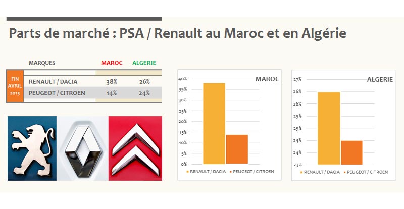 Le Maroc, l'Algérie et la tunisie. Selon les perspectives affichées par les constructeurs français, ces 3 pays du Maghreb devraient suivre une courbe croissante dans les années à venir, et par conséquent deviendront un marché premier pour Renault et PSA.