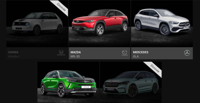 Lancée début décembre, l’élection de la « Plus belle voiture de l'année 2021 » a déjà donné lieu à deux opérations d’écrémage. Deux modèles parmi les cinq prétendants, la Honda e et le Skoda Enyaq, ont été laissés sur le bord de la route. Le MAZDA MX-30, le MERCEDES GLA et l’OPEL Mokka sont toujours en course.