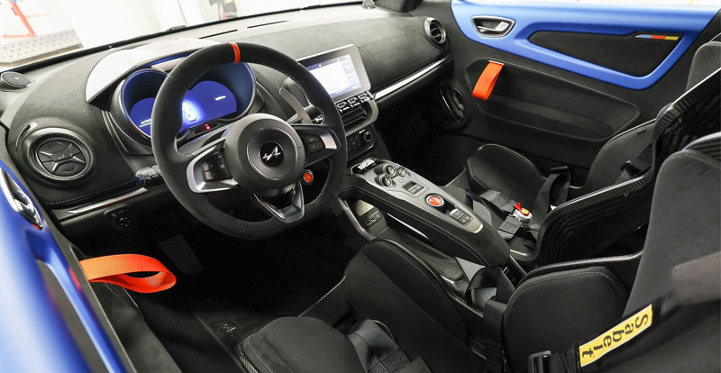 Les capots avant et arrière en carbone sont peints partiellement, respectivement avec les teintes Bleu Racing Mat et Noir Profond de la caisse, alors qu’ils restent 100% aspect carbone sur l’A110 R.