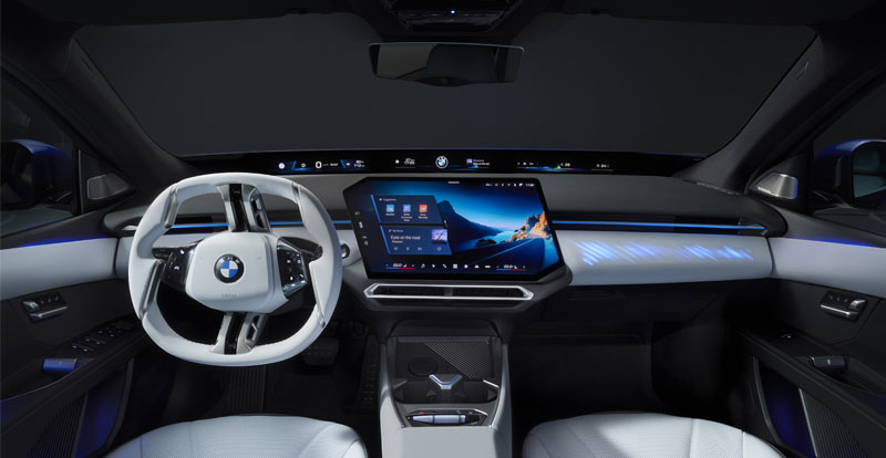 À bord, le second modèle Neue Klasse reprend à l’identique le mobilier de l’iX3. Cet habitacle s’articule autour du volant élégant, du BMW Panoramic Vision qui occupe toute la largeur du véhicule et du grand écran tactile de 17.9 pouces orienté vers le conducteur et tournant autour de la dernière génération du système multimédia de BMW.