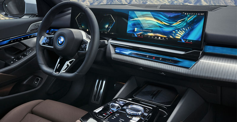 Cette dalle se compose de l’instrumentation de 12,3 pouces et de l’écran tactile de 14,9 pouces tournant autour du dernier système d'exploitation, le BMW OS 8.5. Grâce à ce dernier, la berline permet désormais l'accès aux jeux vidéos.