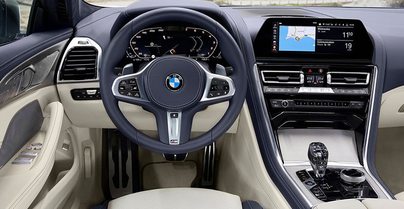 On retrouve surtout le même univers, la même présentation léchée que sur la Série 8 Coupé. Le mariage habile du luxe et de la sportivité laisse sans voix ! Les sièges semi-baquets sont splendides. Les matériaux rivalisent d’éclat et le tout est baigné par la lumière qu’apporte l’incroyable toit panoramique vitré optionnel. Séparé en deux parties, il relie le pare-brise à la lunette arrière et affiche une surface de 1,5 m2.