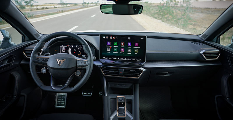 À bord, les principales modifications concernent la planche de bord qui se dote d’un motif paramétrique en 3D. Devant le conducteur, en plus du volant Supersports Cupra et ses boutons satellite désormais disponible de série, on retrouve le Digital Cockpit de 10.25 pouces qui bénéficie d’une nouvelle interface.