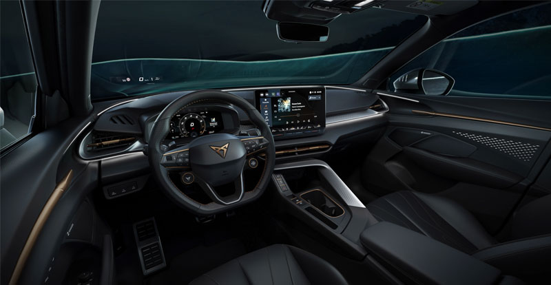 Dans la même veine que les Leon et Formentor restylés, le nouveau venu a droit à un habitacle moderne et technologique. À commencer par la planche de bord orientée vers le conducteur dotée d’un motif paramétrique en 3D et abritant l’écran tactile flottant de 12,9 pouces tournant autour du système d’infodivertissement de dernière génération, ainsi que le digital cockpit de 10,25 pouces secondé par l’Affichage Tête Haute.