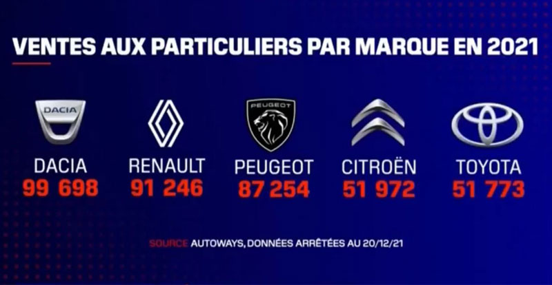 Inédit ! DACIA, avec 99.698 immatriculations, finit l'année 2021 comme étant la marque qui a vendu le plus de véhicules aux particuliers en France, devant sa maison-mère RENAULT (91.246 immatriculations) et PEUGEOT (87.254 immatriculations). Le top 5 est complété par CITRÖEN (51.972 immatriculations) et TOYOTA (51.773 immatriculations).