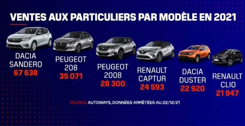 DACIA doit cette performance à sa Sandero qui, depuis 2017, s'est imposée comme la voiture neuve la plus achetée par les Français (hors entreprises et loueurs). En 2021, la troisième génération de la citadine a trouvé 67.638 preneurs. Elle est suivie par la PEUGEOT 208 (35.071 immatriculations), et le PEUGEOT 2008 (28.300 immatriculations).