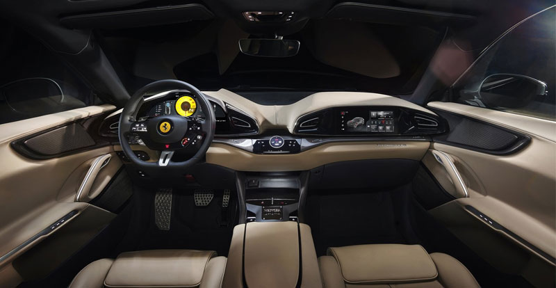 La planche de bord à double bosse est elle aussi originale. Elle se compose d'un volant à sélecteur rotatif Manettino, d’une instrumentation numérique face au conducteur et d’un écran tactile de 10,2 pouces, déportée du milieu pour se retrouver face au passager.