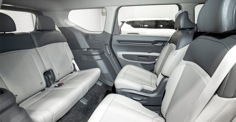 Soulignons ici que KIA a fait en sorte que l’EV9, disponible en version six ou sept places, mette tous ses occupants sur un pied d’égalité en matière d’espace, de confort et d’expérience embarquée. Ainsi, les occupants des sièges des première et deuxième rangées peuvent incliner simultanément leurs sièges pour se détendre et se reposer pendant la recharge du véhicule. De plus, les passagers de la deuxième rangée peuvent très facilement pivoter leurs sièges de 180° pour pouvoir interagir avec les occupants de la troisième rangée.