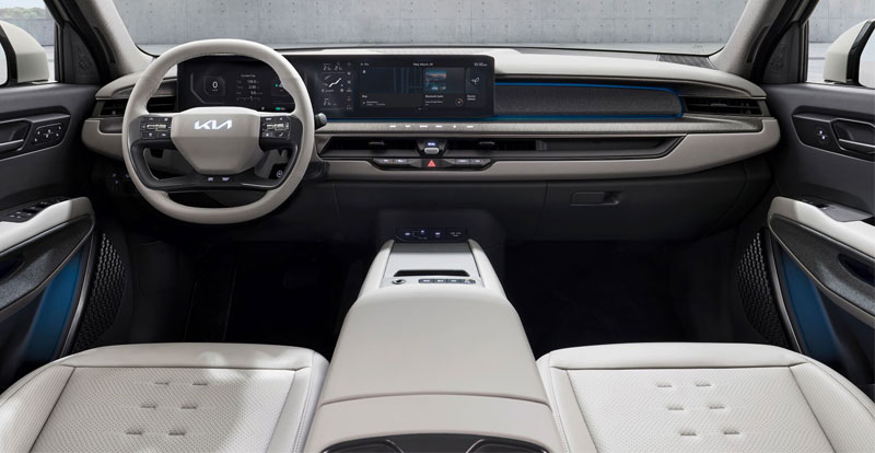 L’EV9 se distingue également par sa planche de bord flottante de forme panoramique, dont la structure ouverte s’étire du volant jusqu’au centre de l’habitacle. Elle abrite deux écrans tactiles de 12,3 pouces et l’affichage à segments qui permettent de commander très simplement les fonctions du véhicule tout en limitant au maximum le nombre de boutons physiques.
