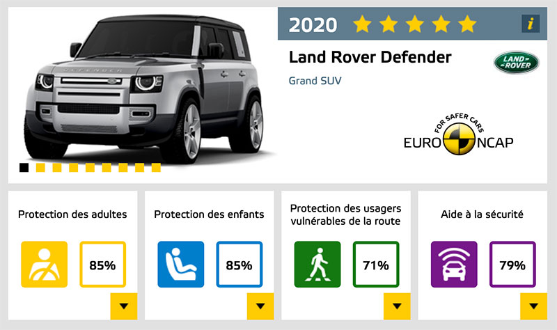 Ce barda a récemment fait merveille aux crash-tests Euro NCAP. La version 5 portes de l’iconique 4x4 british, le Defender 110, y a obtenu en effet la note maximale de cinq étoiles !