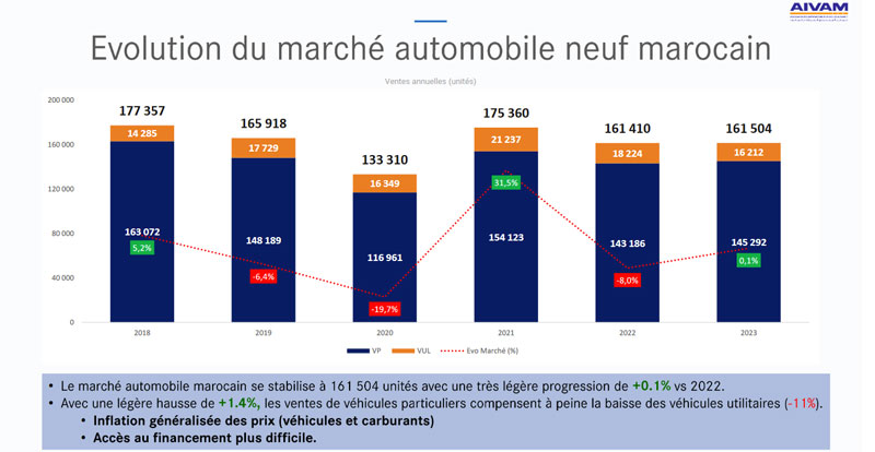 D’ailleurs, lors de ce rendez-vous tenu l’année dernière, la prophétie du chef de la guilde des importateurs voulait que le marché soit relativement stable. Et ce fut une nouvelle fois le cas ! Après la décevante performance enregistrée en 2022 avec 161.410 véhicules écoulés (-8% comparé à 2021), le marché automobile marocain du neuf a réalisé une infime embellie de l’ordre de 0.1% pour s’établir à 161.504 unités vendues en 2023.