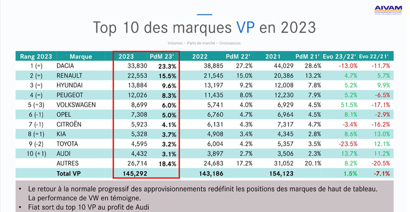 Le tandem DACIA/RENAULT a certes perdu 3.4 points de parts de marché mais finit, une nouvelle fois, l’année en fauteuil de leader pour le premier et dauphin pour le second, avec 38.8% de parts de marché. HYUNDAI (9,6% de parts de marché) et PEUGEOT (8.3%) gardent respectivement leur troisième et quatrième place. Dans le reste du classement, VW (6% de parts de marché) signe la meilleure progression de ce Top 10 avec +51.5% et se retrouve désormais 5ème ! Enfin, KIA (3.7% de parts de marché) gagne une place, tout comme AUDI (3.1% de parts de marché) qui s’offre cette année le luxe de figurer dans le Top 10 au détriment de FIAT !