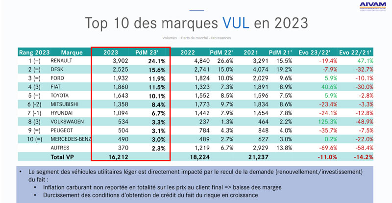 Du côté de ce dernier, RENAULT perd 2.5 points (24.1% de parts de marché) mais reste leader devant DFSK (15.6%). FIAT (11.5%) gagne trois places pour se retrouver au 4ème rang, tout comme VW (3.3%) qui fait cette année irruption dans le Top 10 et se classe 8ème.