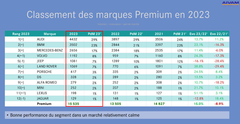 Concernant le marché Premium, ses ventes représentent cette année 10.7% (+1.3%) des ventes totales VP. Soulignons ici qu’il a réalisé une croissance supérieure à celle du marché généraliste, tout en renforçant davantage sa position sur les véhicules électrifiés. La part de l’hybride et de l’hybride rechargeable s’est ainsi établie à 4% sur le segment Premium, contre 0.6% pour l’ensemble du marché.