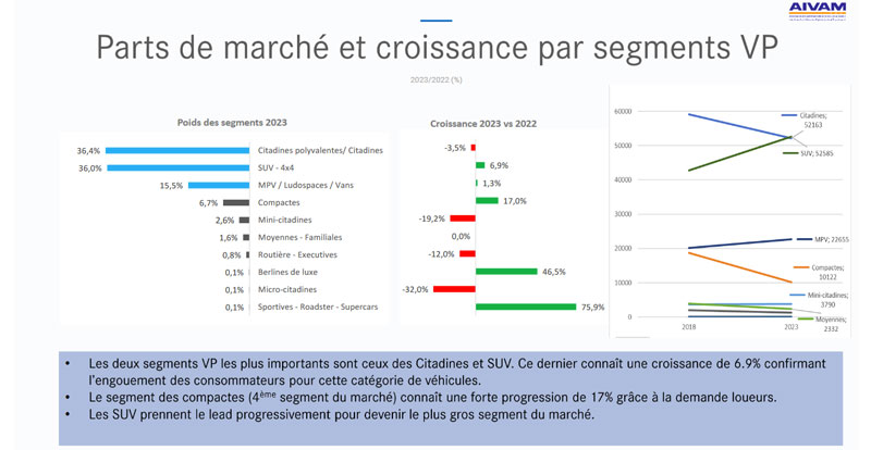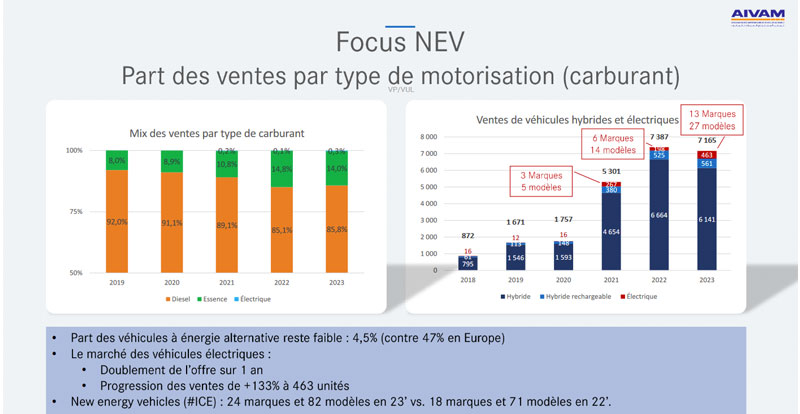Soulignons tout de même que le marché marocain continue d’attirer de nouveaux acteurs de ce segment comme MG et BYD : en 2023, 24 marques proposaient 82 modèles, contre 18 marques et 71 modèles en 2022.