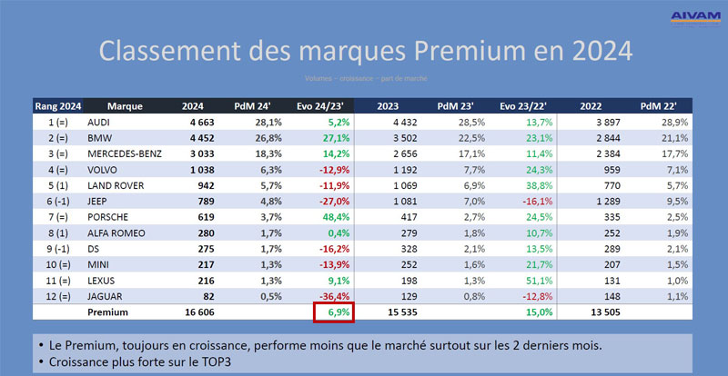 Concernant le marché Premium, ses ventes représentent cette année 10.6% (-0.1%) des ventes totales VP. Soulignons ici que contrairement à 2023, il a réalisé lors de l’année écoulée une croissance inférieure (+6.9%) à celle du marché généraliste, mais continue tout de même de renforcer sa position sur les véhicules électrifiés. La part de l’hybride, de l’hybride rechargeable et de l’électrique s’est ainsi établie à 9.7% sur le segment Premium, contre 7.3% pour le marché généraliste.