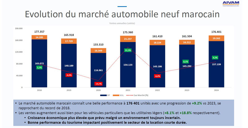 Après la performance « flat » enregistrée en 2023 avec 161.504 véhicules écoulés (+0.1% comparé à 2022), le marché automobile marocain du neuf a réalisé une belle progression de l’ordre de +9.2% pour s’établir à 176.401 unités vendues en 2024 (+6.3% comparé à l’année référence de 2019), soit seulement 958 véhicules de moins que le record de 177.359 unités enregistré en 2018 !