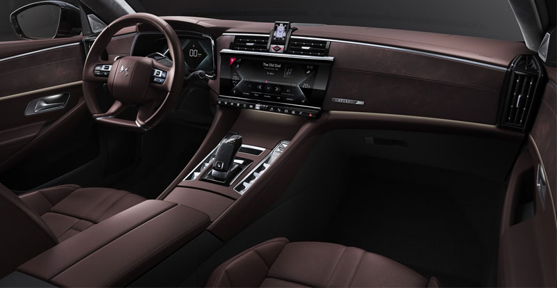 Evidemment, l’habitacle est dans la même veine. La présentation s’inspire clairement de celle du DS 7 Crossback, mais semble néanmoins être un cran plus exclusive et plus raffinée. Au menu : sièges bracelet de montre drapés de maroquinerie au patinage exquis et aux surpiqûres point perle, montre B.R.M., guillochage « Clous de Paris » pour les commandes de la console centrale, deux écrans numériques de belle taille…