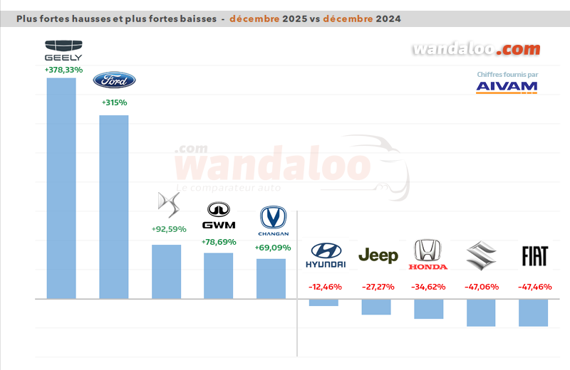 Dans le détail, le marché des véhicules particuliers (VP) a enregistré une hausse de +19.88% avec 24.453 unités vendues en décembre 2025, par rapport au mois de décembre 2024 durant lequel s’étaient écoulées 20.398 unités. Le marché des véhicules utilitaires légers (VUL) a quant à lui progressé de +30.44% avec 2.901 véhicules écoulés en décembre dernier, contre 2.224 véhicules vendus la même période un an auparavant.