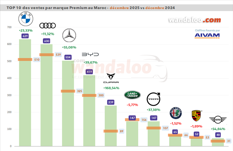 Dans le marché du Premium, BMW termine le mois de décembre en première position. La marque à l’hélice enregistre 629 unités écoulées et une progression de +23.33%.