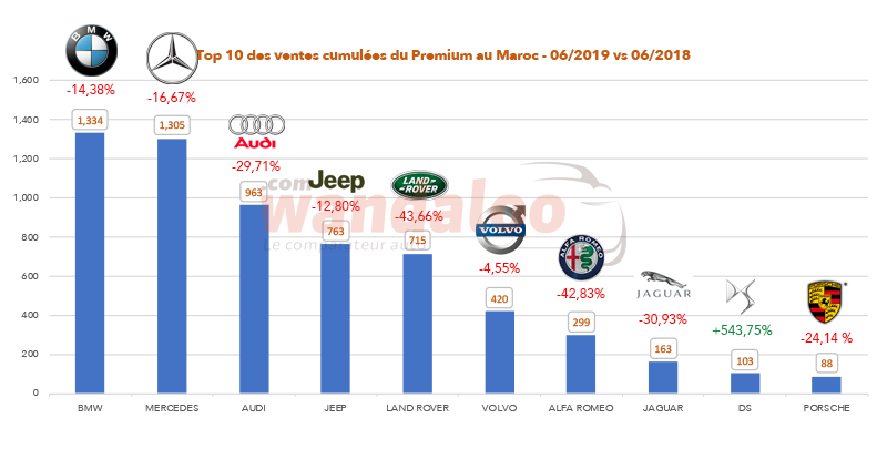 Au sommet du Top 10 des ventes cumulées des marques opérant dans le segment premium malgré un mois de juin compliqué (-3,57% en glissement annuel), BMW a vendu 1.334 unités, ce qui représente une chute de 14,38% par rapport au premier semestre 2018. MERCEDES n’est pas très loin, avec 1.305 unités vendues. La marque à l’étoile a enregistré une progression de ses ventes le mois dernier (+2,22%) et affiche un repli de 16,67% depuis janvier par rapport au premier semestre de l’année dernière.
