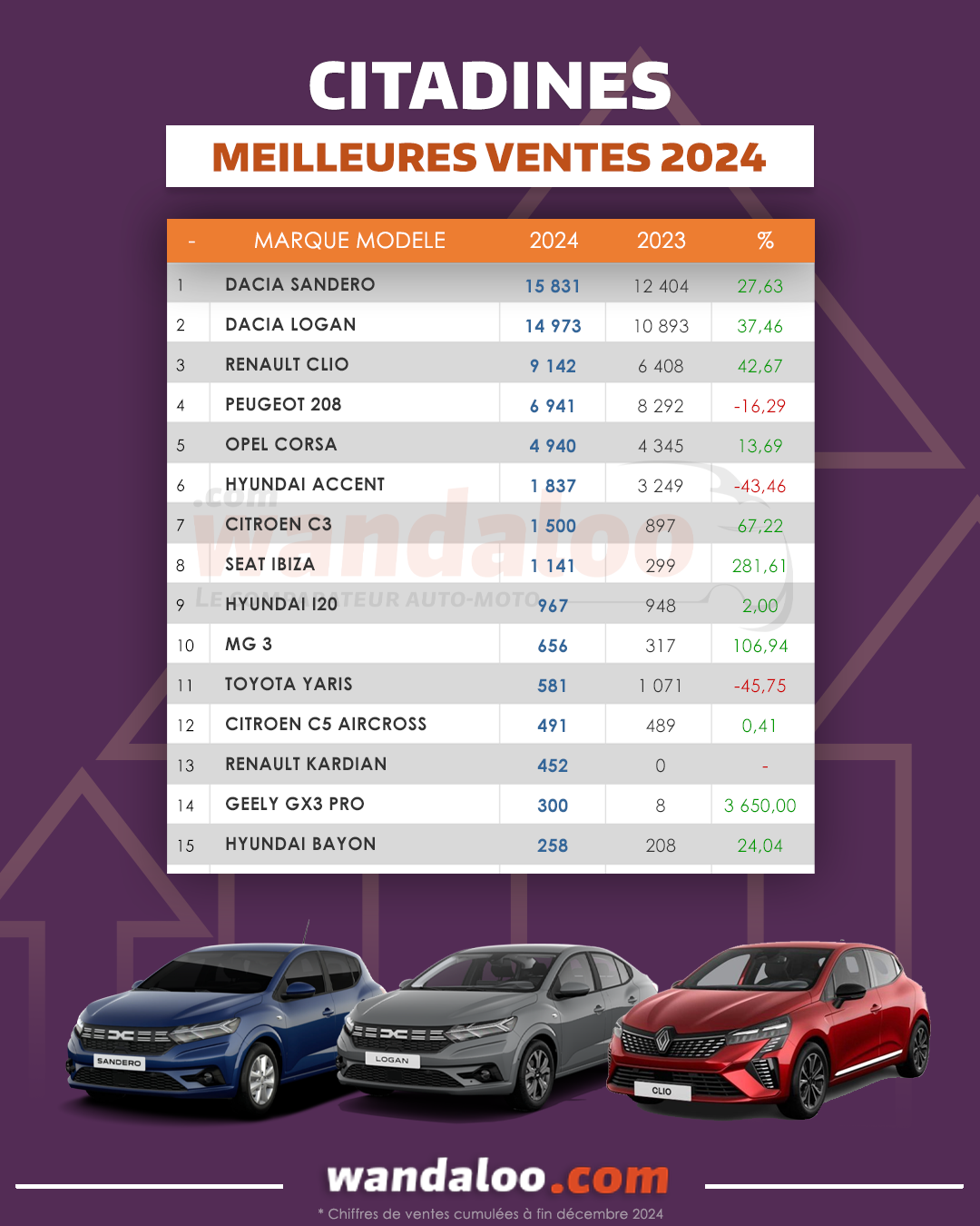 En 2024, et sans surprise, DACIA et RENAULT continuent de dominer le segment des citadines au Maroc. Pour leur première année sur notre marché, les MG 3 et GEELY GX3 Pro ont réussi de se positionner parmi les références de ce segment.