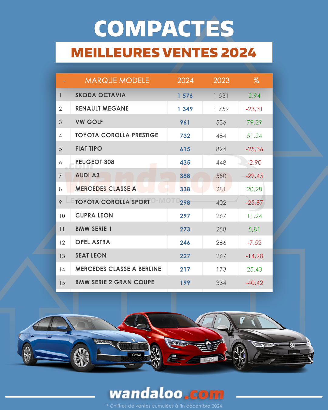 La ŠKODA Octavia se hisse pour la première fois en tête du segment des compactes, historiquement dominé par RENAULT Mégane, qui arrive en deuxième position. A noter que les deux hybrides de TOYOTA ont cumulé plus de mille unités à fin décembre 2024.