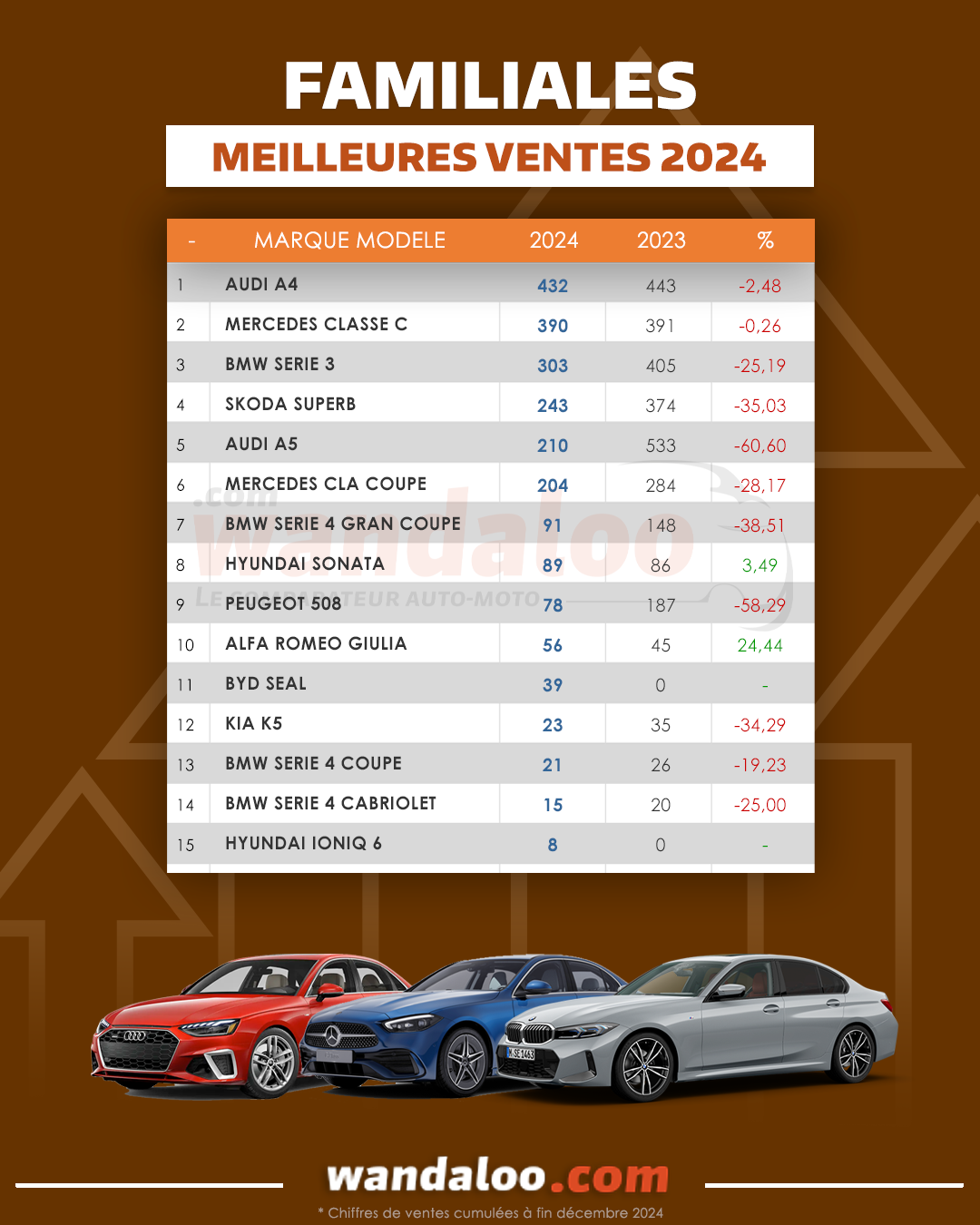 Dans un segment encore et toujours dominé par les marques Premium, le trio de tête reste inchangé ! A souligner que les BYD SEAL et HYUNDAI IONIQ 6 ( deux véhicules 100% électriques ) figurent dans ce classement !
