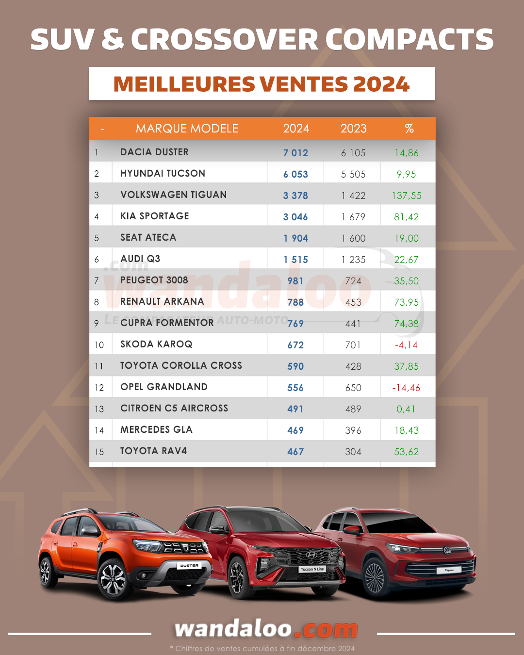DACIA Duster et HYUNDAI Tucson dominent de loin ce segment très prisé par les clients marocains. Et grâce à sa nouvelle mouture annoncée au Maroc en mai 2024, le VW Tiguan s'est vu ses ventes augmenter dans la 2ème moitié de l'année !