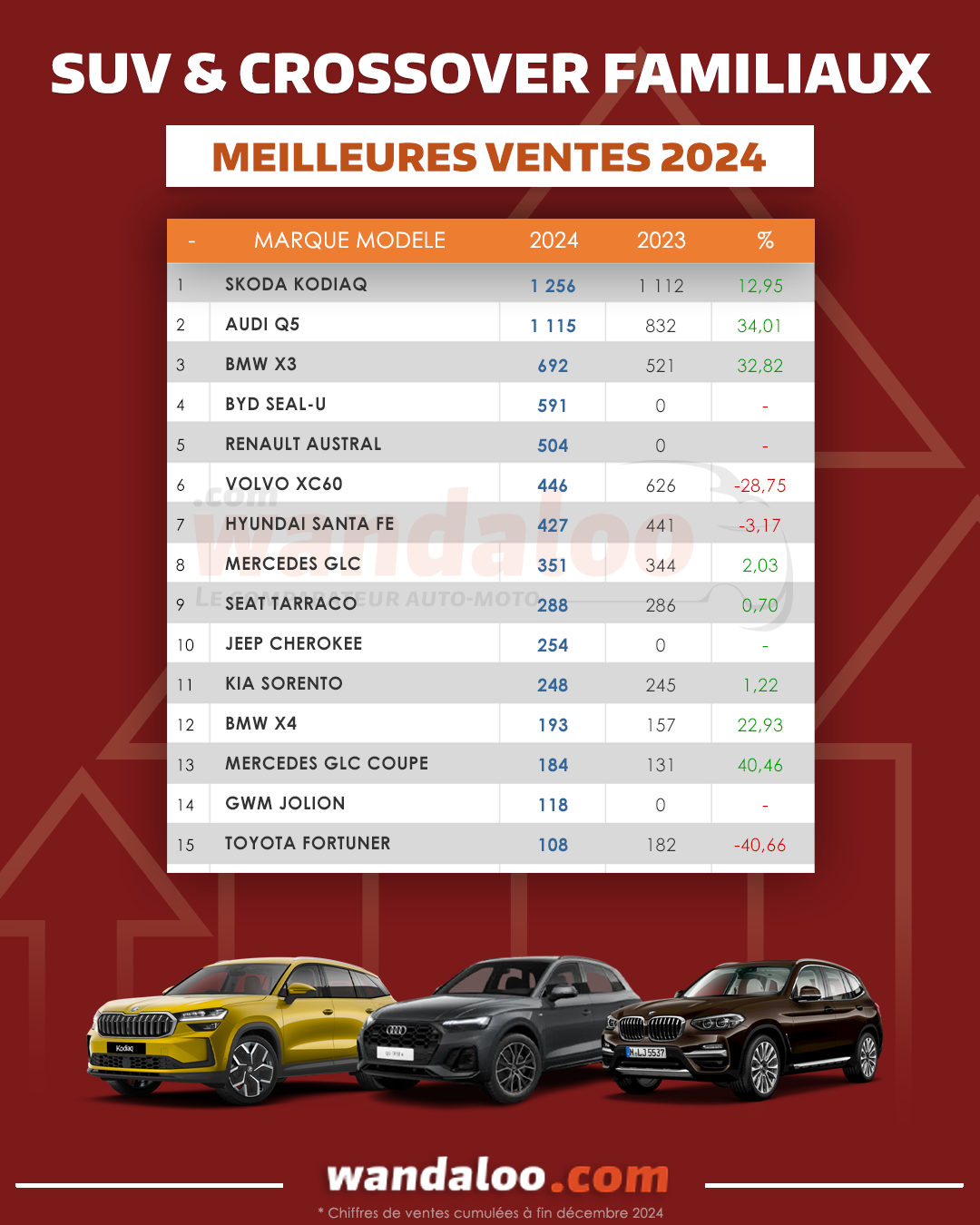 Au terme de l'année 2024, ŠKODA Kodiaq a réussi à devancer les AUDI Q5 et BMW X3. A souligner que quatre modèles proposent des variantes hybrides figurent dans ce classement.