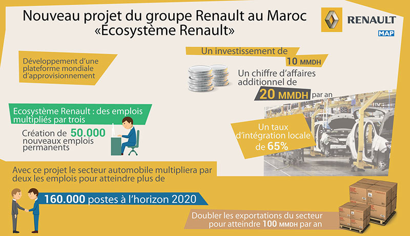 S’agissant de l’impact du projet écosystème Renault, le ministre a relevé que ce dernier, qui mobilise des investissements de l’ordre de 10 milliards de dirhams, vise à générer un chiffre d’affaires additionnel de 20 milliards DH par an, triplant ainsi le montant des achats par le constructeur Renault, de pièces fabriquées sur le territoire marocain, tripler les emplois générés par Renault, en créant 50.000 nouveaux emplois permanents pour atteindre un taux d’intégration locale de 65%.