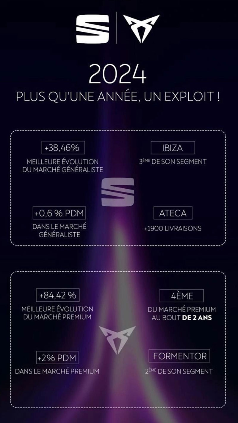 Cette année, SEAT a relevé le défi avec brio en proposant une gamme totalement repensée, alliant motorisations performantes et technologies de pointe. Ces résultats sont le fruit d’un travail passionné, d’un engagement constant vers l’innovation et surtout, de la confiance renouvelée de ses clients.