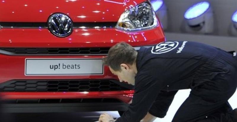 Un homme déguisé en mécano Volkswagen est monté sur scène pendant la conférence de presse de constructeur allemand Volkswagen au salon de l'automobile de Genève où nous y étions pour vous.