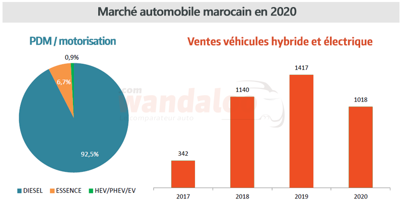 En 2020 comme aupravant, le marché marocain de l'automobile reste fortement "dieselisé" avec près de 92% de part de marché. Quant au volume annuel des véhicules hybride et électrique, il évolue à petite cadence. Si la marque TOYOTA est leader en la matière avec près de 85%, VOLVO pour sa part y est présente à hauteur de 2,5% !
